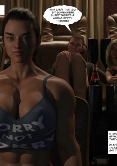 Big female bodybuilder Jess convinces little Soren to give her more intel on the plans of her ex-boyfriend Arthur and his new flame. Turns out, says a strongarmed Soren, they'll be at the movie theatre that weekend. And so Jess happens to be there too, on the same day, for the same movie. She teases the couple, and then tells them what she wants.
