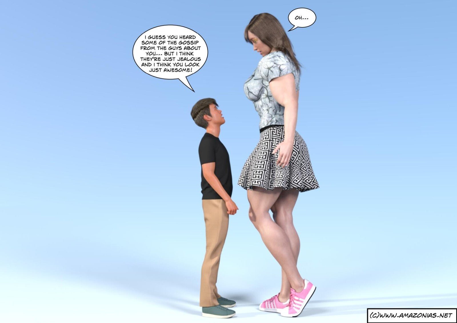 This romantic comic features many comparisons, great lifts, flexing, worshipping, big boobs, soft domination, a NSFW scene involving weights, and so much more.