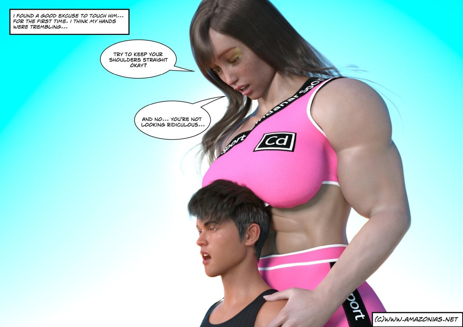 Female bodybuilder Joan is tall, smart and gorgeous, but she's also shy. Fortunately little Alex, a young looking eighteen year old who is in his first year of college, is more forthcoming. When he approaches the musclegirl, she is afraid but also overjoyed.